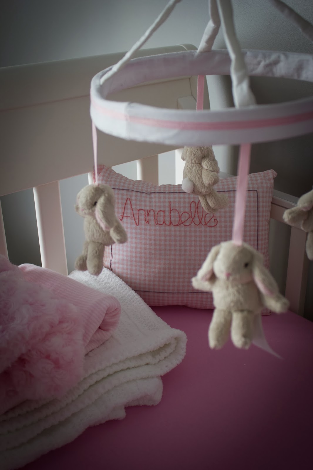 One of our inspirations for Annabelle’s nursery just so happened to be the pillow that OtterburnPQ made for our little girl. It is pink and white and oh so cute.