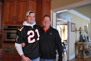 Mr. Bear, Mrs. H, and Mr. H (my in-laws). Would you believe Mr. Bear wearing his jersey from FOURTH GRADE before the Falcons Playoffs Game?