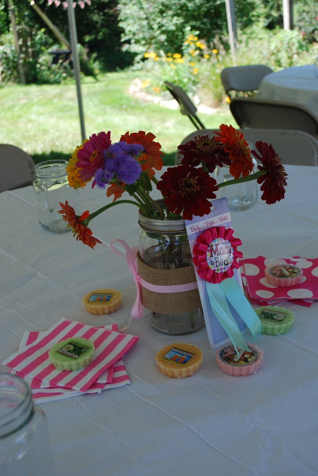 Details include: Fresh cut flowers in mason jars, plus Yankee Candle favors for the guests