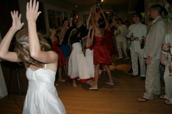 Notice all the bridesmaids wearing their flippyflops during the bouquet toss! I think that the flip flops were also a very awesome gift so none of the girls had to run around barefoot in the cold.