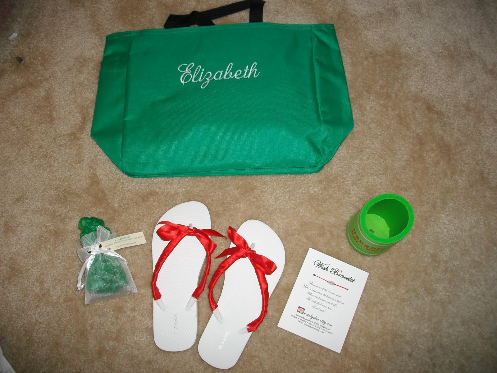 A personalized bag, handmade flip flops, drop pearl necklace from Etsy, PLUS tissues, gum, lip gloss, make-up remover wipes, granola bars, water bottle (not pictured)