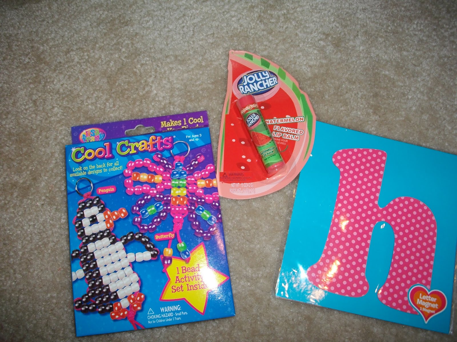 Make-your-own keychain, lip gloss, letter magnet, PLUS personalized tote bag & matching towel, flip flops, make-your-own-purse kit (not pictured)