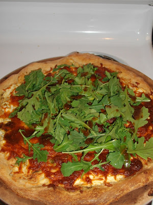6. Remove the pizza from the oven. While it is still hot, cover the pie with arugula – use a lot or a little depending on how much you like the green leaf.