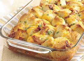 2. Separate dough into 8 biscuits; cut each into quarters. Gently stir biscuit pieces into egg mixture to coat evenly. Fold in bacon and cheese. Spoon mixture into sprayed dish; arrange biscuit pieces in single layer.