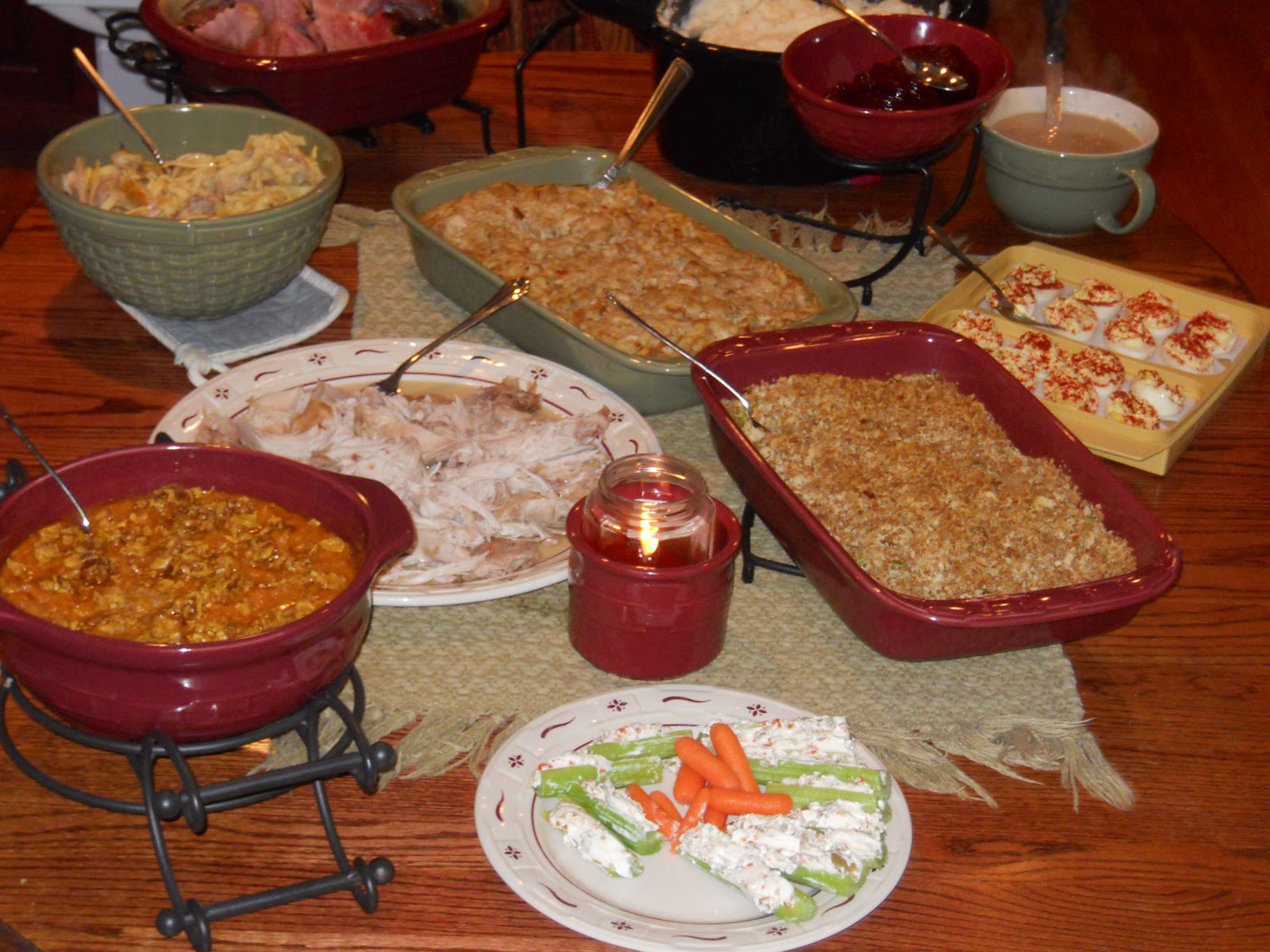 Southern Thanksgiving: sweet potato casserole, turkey, broccoli casserole, ‘dressing,’ ham (cooked in cola), noodles, deviled eggs, cranberries, mashed taters, gravy…. and green olive cream cheese boats (those are new englandish and in honor of me!)