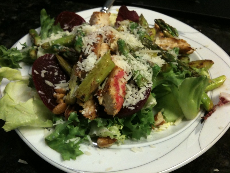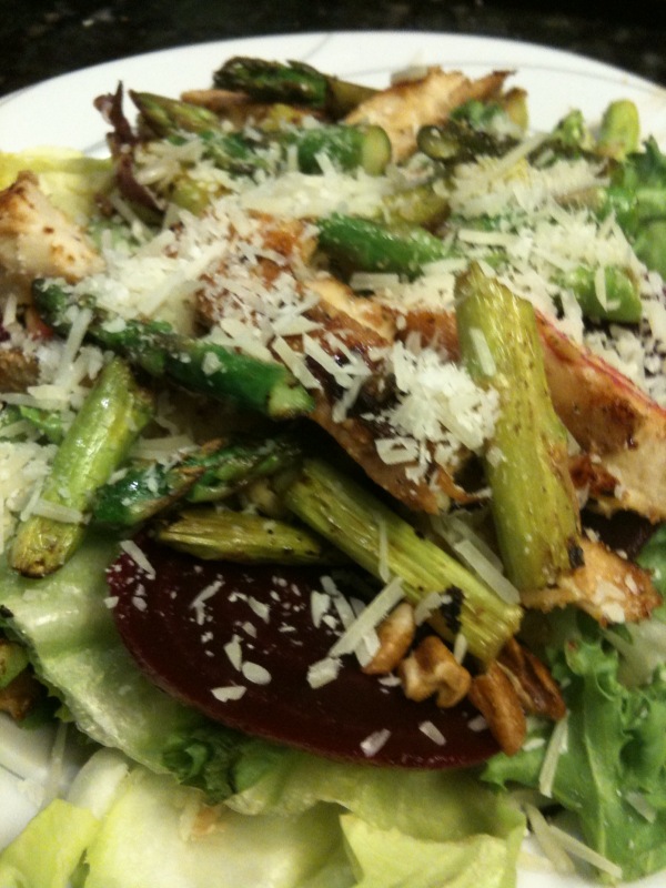 Canned beets, asparagus cooked in a skillet with garlic salt and spray Pam, walnuts, mixed greens, shredded parmesan, and chicken (marinated in organic ginger soy dressing)